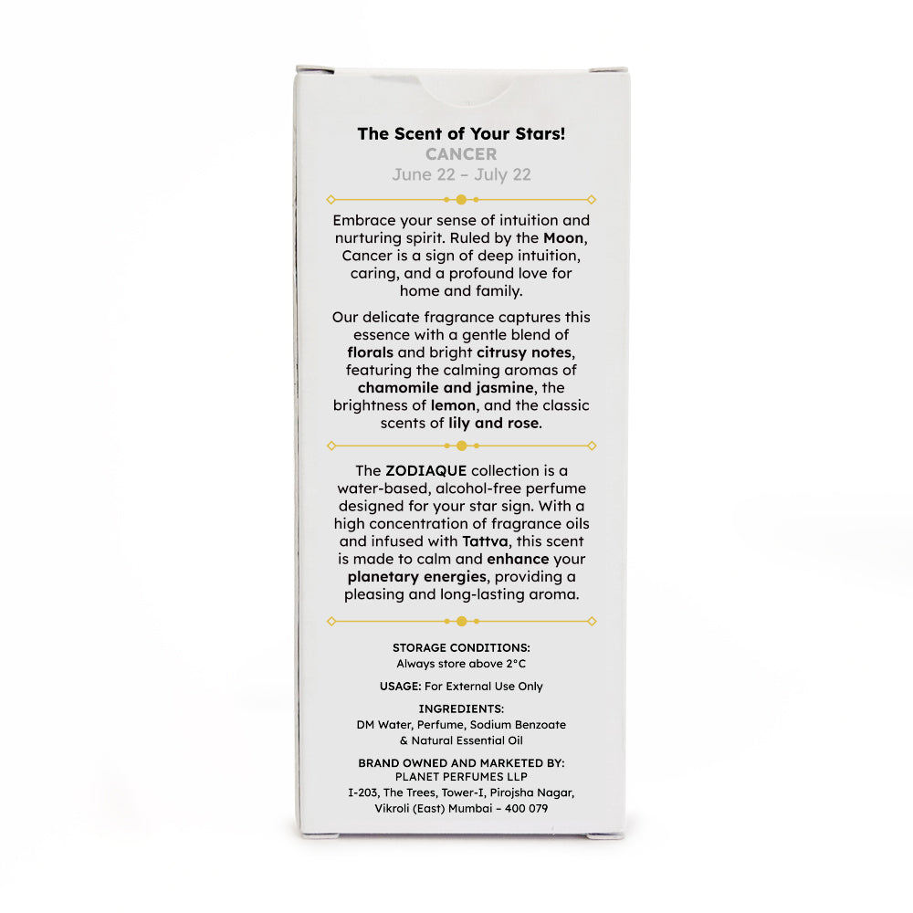 Deeply intuitive with a nurturing soul, Cancerians always make space for others, sometimes at their own expense. Zodiaque Cancer mirrors this spirit, blooming with the floral notes of jasmine, lily, and rose, brightened by lemon and soothing chamomile, creating a soothing fragrance that steadies sensitive emotions.