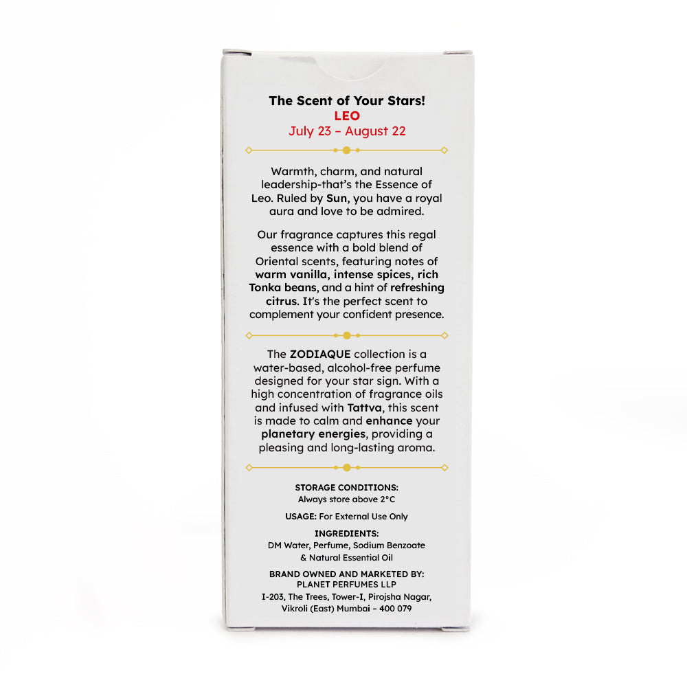Radiant, confident, and a born leader, Leo moves through life with warmth and charisma. Zodiaque Leo translates that into fragrance, pairing warm vanilla, mellow spices, rich Tonka beans, and a citrus lift that steadies passion, keeps the spirit grounded, and brings ease to intense moments.